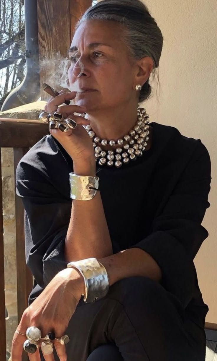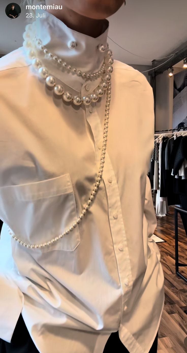 I keep pinning images of pearls layered on top of each other, as well as bold silver bangles and cuffs stacked. There’s just something about bold yet minimal jewelry that reminds me of armory. I appreciate it as a way to play with contrast within my outfits too. In some ways it has that more is more vibe, and yet I still read it as edging towards minimalism when everything else about the look is paired back.